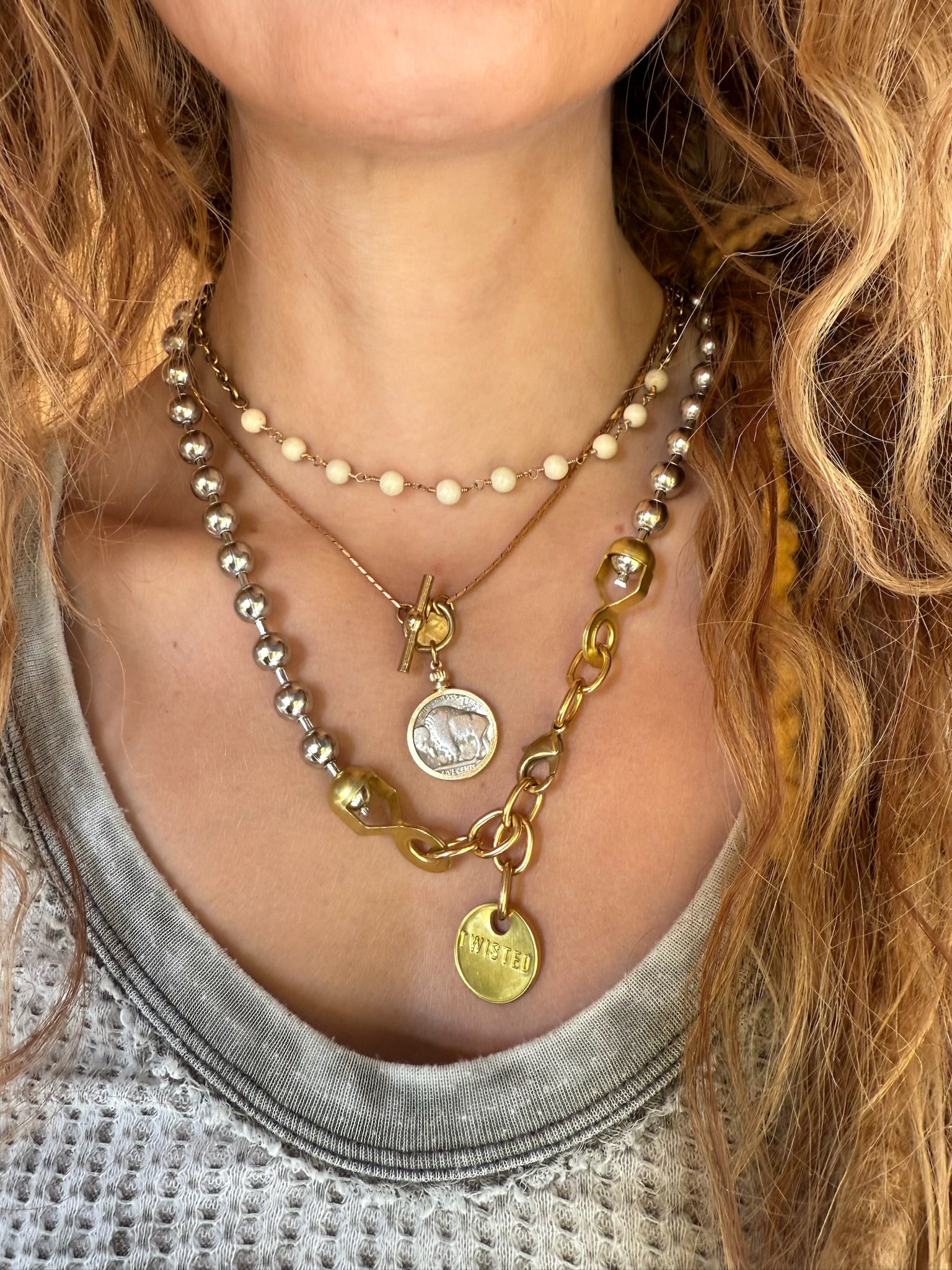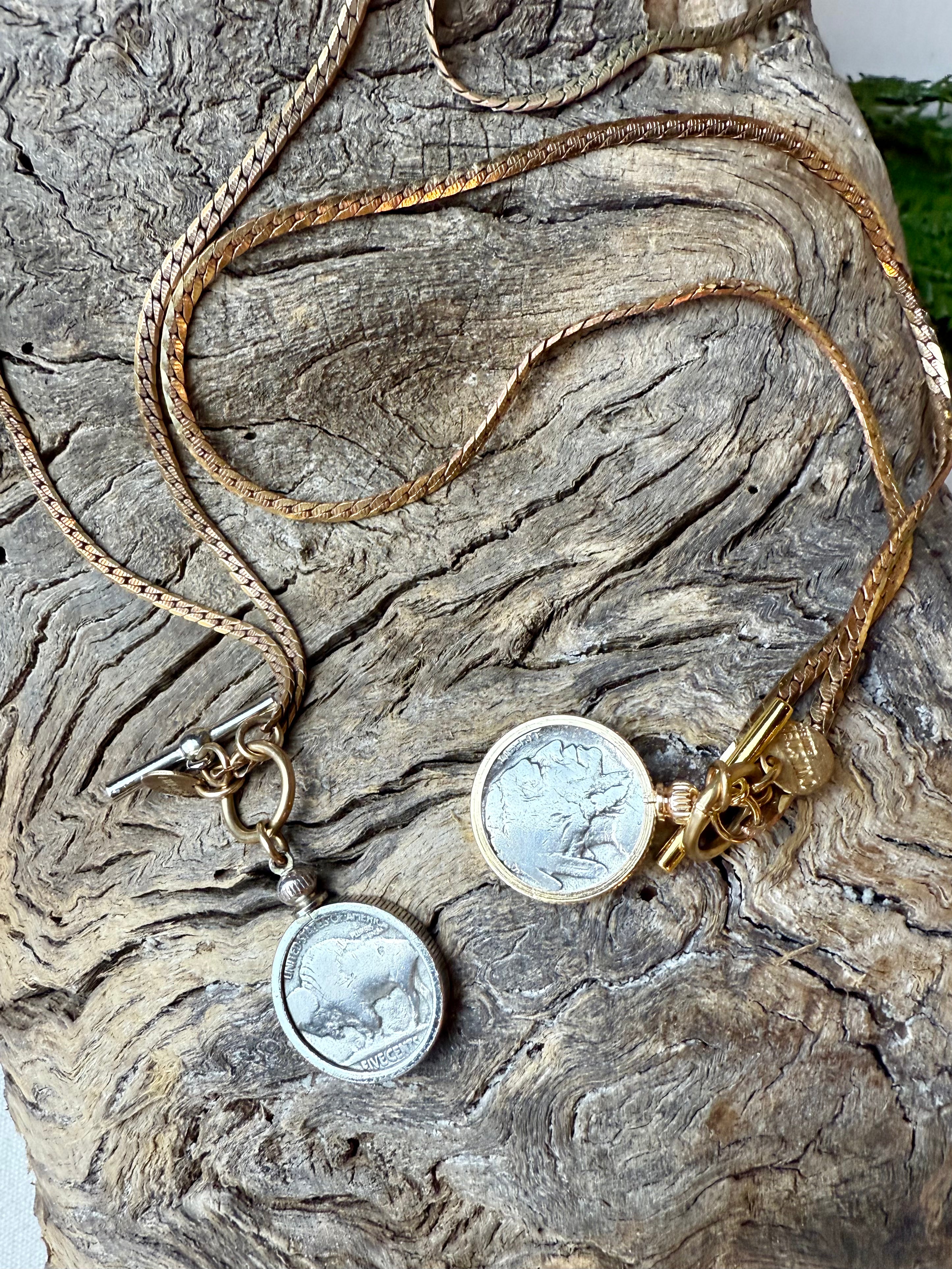 A striking blend of nostalgia and style, this buffalo-nickel pendant necklace turns an iconic American coin into a wear-everywhere statement. Suspended from either a warm brass or sterling silver chain and finished with a front toggle clasp, it brings a curated, effortlessly layered look—without needing multiple pieces.