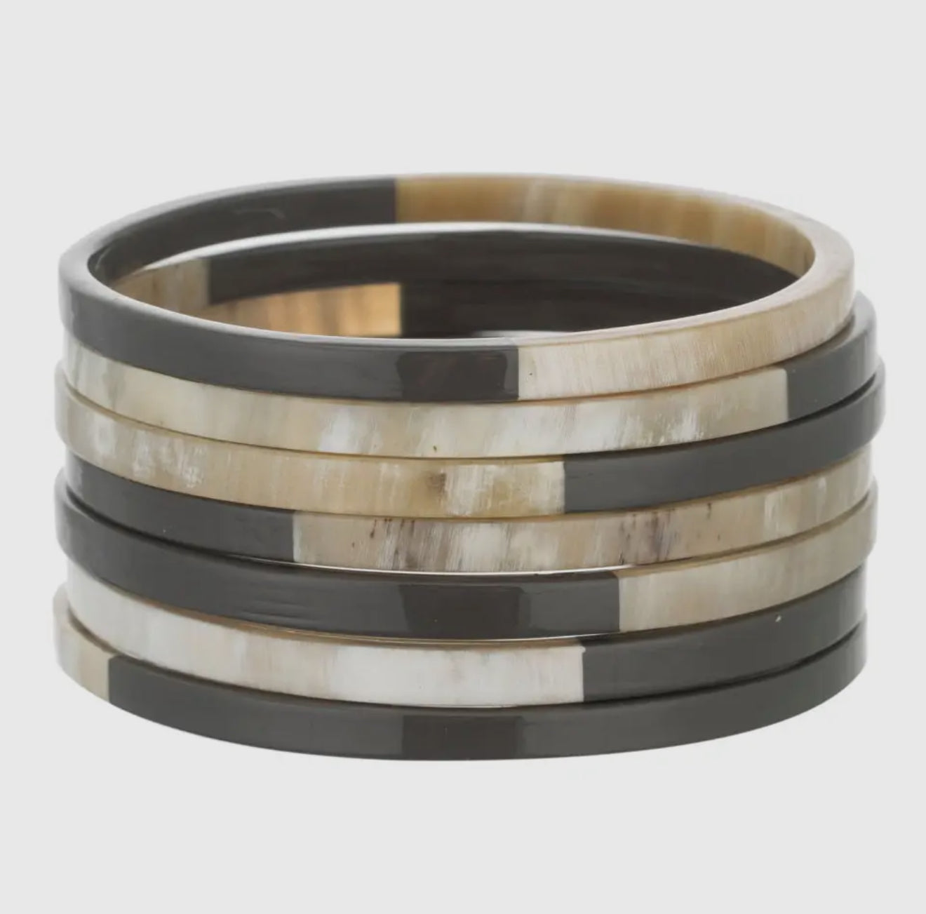 Natural buffalo horn bangles featuring a sleek flat-edge silhouette and a striking half silver-leaf or half gold leaf lacquer finish for a modern, artisanal touch. Crafted from genuine buffalo horn, each bangle showcases its own unique variation in tone, pattern, and texture, making every set truly one-of-a-kind and naturally distinct from the images shown.