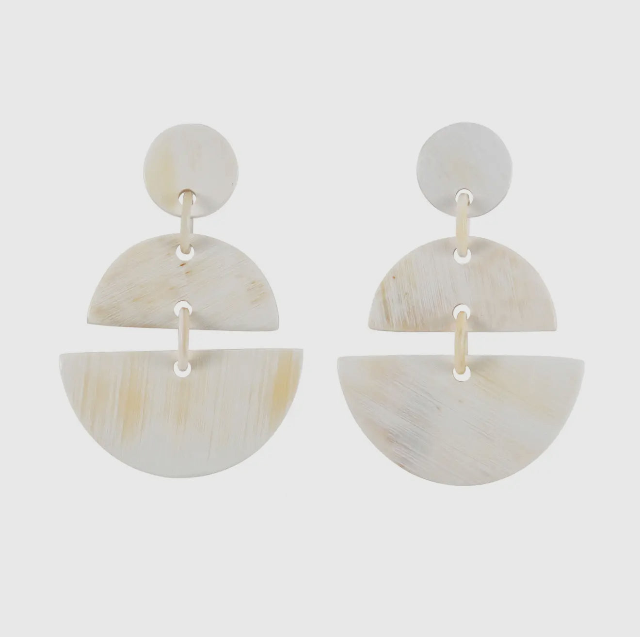 These statement earrings blend bold geometric design with the soft, organic beauty of natural buffalo horn. Three linked shapes—a circle, half-moon, and oversized semicircle—create a cascading silhouette that moves beautifully and feels effortlessly modern. The creamy, marbled tones of the horn make each pair truly one of a kind, offering subtle variation and a warm, earthy glow.