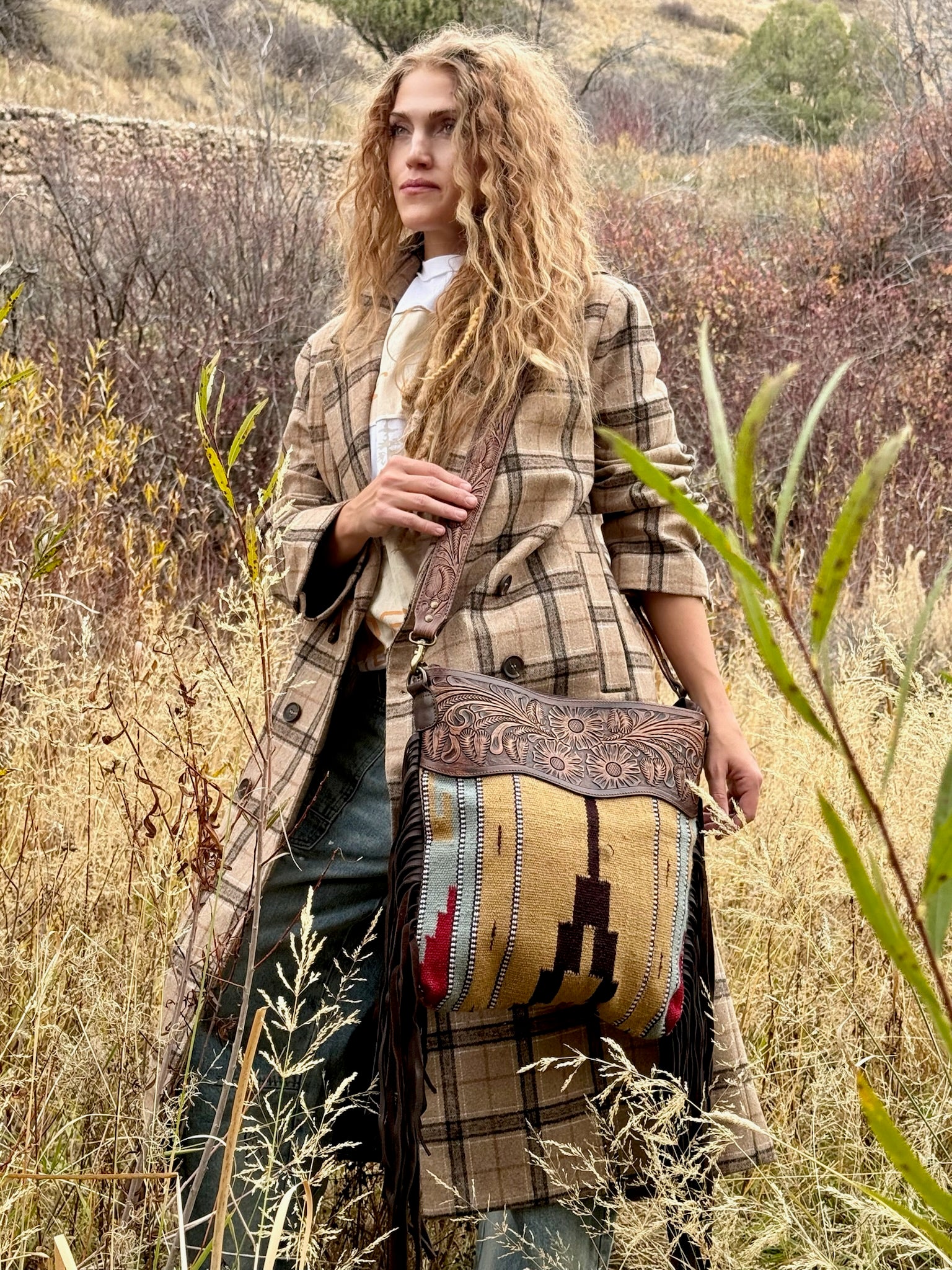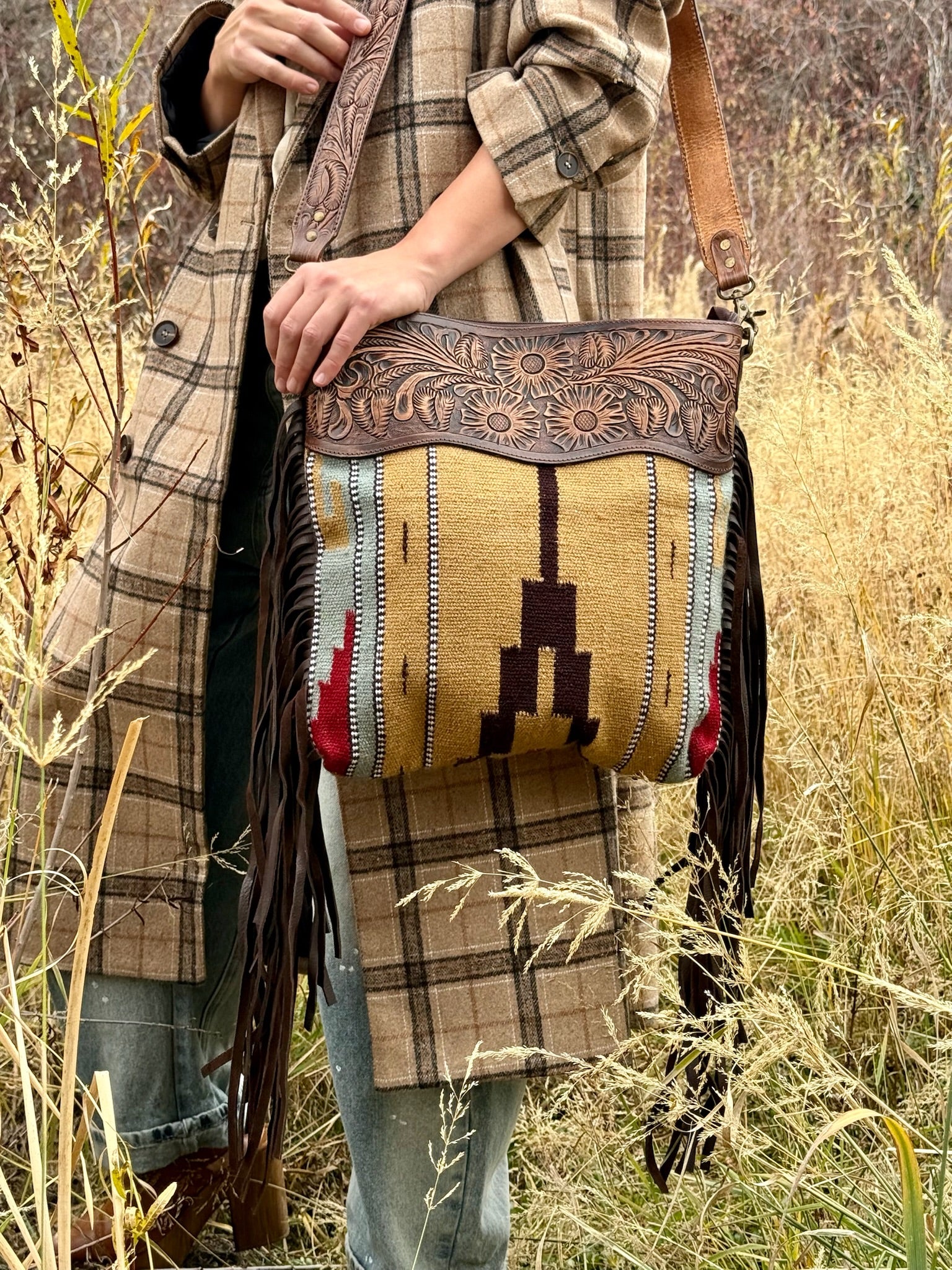 There’s an easy, free-spirited charm to this crossbody—one of those pieces that feels collected, storied, and ready for wherever the day wanders. The woven front panel brings warm desert golds, deep blacks, and soft greys together in a pattern that feels both bold and timeless. Paired with beautifully tooled leather and long, swinging fringe, it has that effortless boho-meets-mountain feel that goes just as well with denim as it does with a favorite coat.
