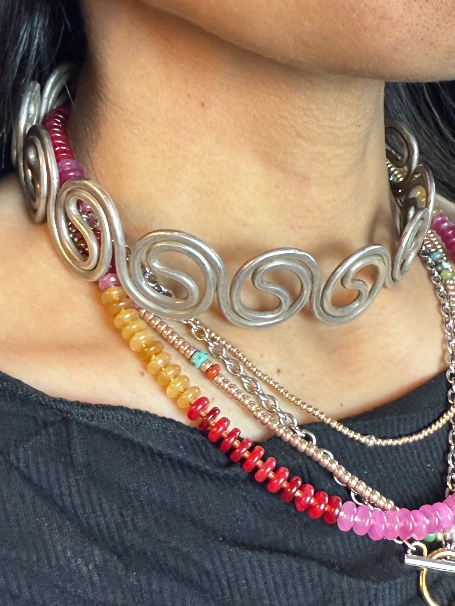 This sculptural necklace turns organic movement into a wearable work of art. Hand-forged silver loops flow into one another, creating an unbroken swirl pattern that sits beautifully along the neckline. The substantial yet airy design gives it a striking presence without feeling heavy, while the soft, brushed finish adds a vintage-meets-modern glow.